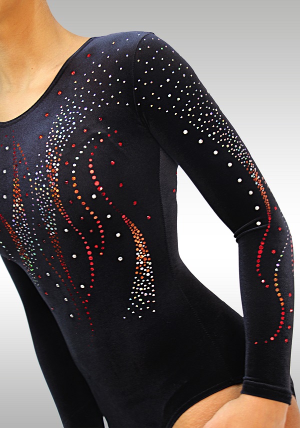 Leotard V706 long sleeves in black velvet with a superb decoration of red and silver glitters This Leotard in black velvet has a beatiful design of red and silver glitters on the front. For an assorted legging, choose your model and color in the category 'smooth velvet'